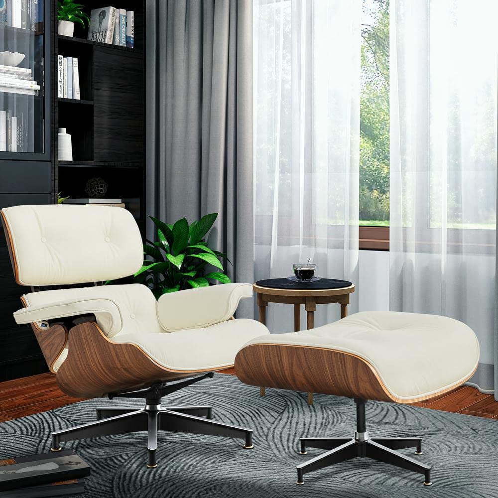 Amazon Com Genuine Leather Lounge Chair With Ottoman Mid Century Recliner Replica With 8 Layer Solid Wood And Heavy Duty Aluminum Base For Living Room Study Lounge Ivory White Home Kitchen